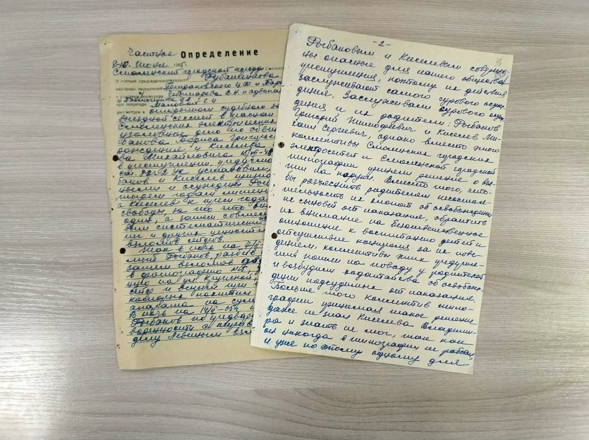 Ранее мы рассказывали об уголовном деле, по которому был вынесен приговор в отношении несовершеннолетних Рыбакова и Киселева. По данному делу одновременно с приговором судом было вынесено частное определение, в котором в частности было указано следующее: «Рыбаковым и Киселевым совершены опасные для нашего общества преступления, поэтому их действия заслуживают самого сурового осуждения. Заслуживали осуждения и их родители: Р. и К., однако, вместо этого, коллективы … электросетей и … типографии приняли решение о взятии на поруки. Вместо того, чтобы разъяснить родителям несостоятельность их хлопот об освобождении их сыновей от наказания, обратить их внимание на безответственное отношение к воспитанию детей и отсутствие контроля за их поведением, коллективы этих предприятий пошли на поводу у родителей и возбудили ходатайства об освобождении подсудимых от наказания. Больше того, коллектив типографии, принимая такое решение, не знал К. и знать не мог, так как он никогда в типографии не работал, и уже поэтому одному для ходатайства о поруках и выделения защитника не было оснований. Коллектив же рабочих и служащих электросетей знал, что подсудимый Рыбаков груб со старшими товарищами по работе, не сдержал слова, данного администрации продолжать учебу в вечерней школе, и упорно сопротивляется воздействию коллектива». Учитывая, что ходатайства о взятии на поруки при таких обстоятельствах не способствуют успешной борьбе с преступностью среди несовершеннолетних и их перевоспитанию, народным судом было определено изложенное довести до сведения секретарей партийных организаций КПСС …. электрических сетей и ….. типографии, поставить в известность о данном определении первого секретаря Смоленского горкома КПСС.